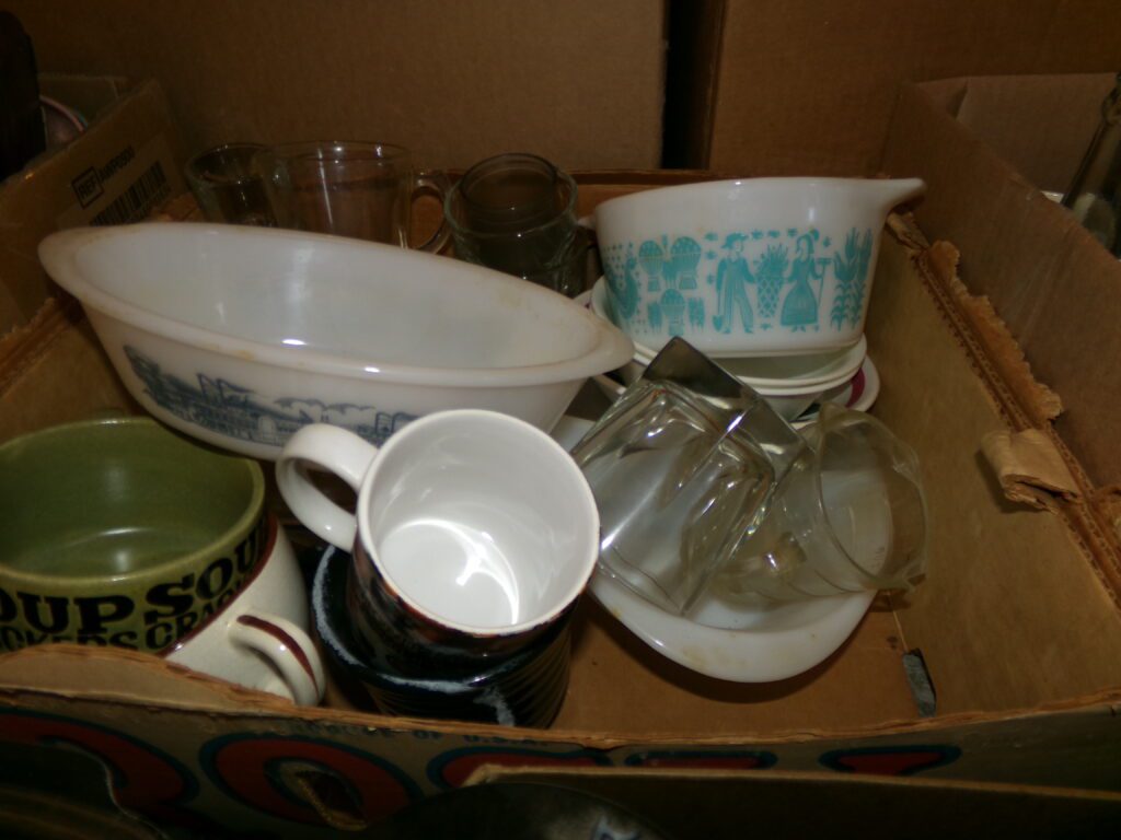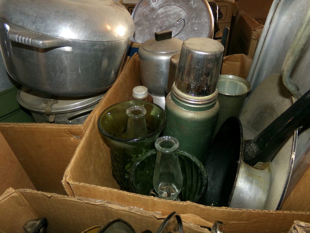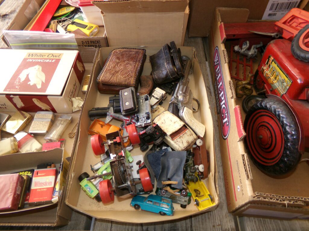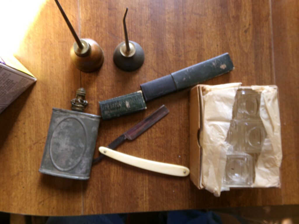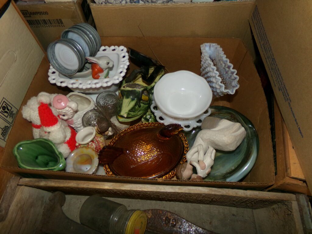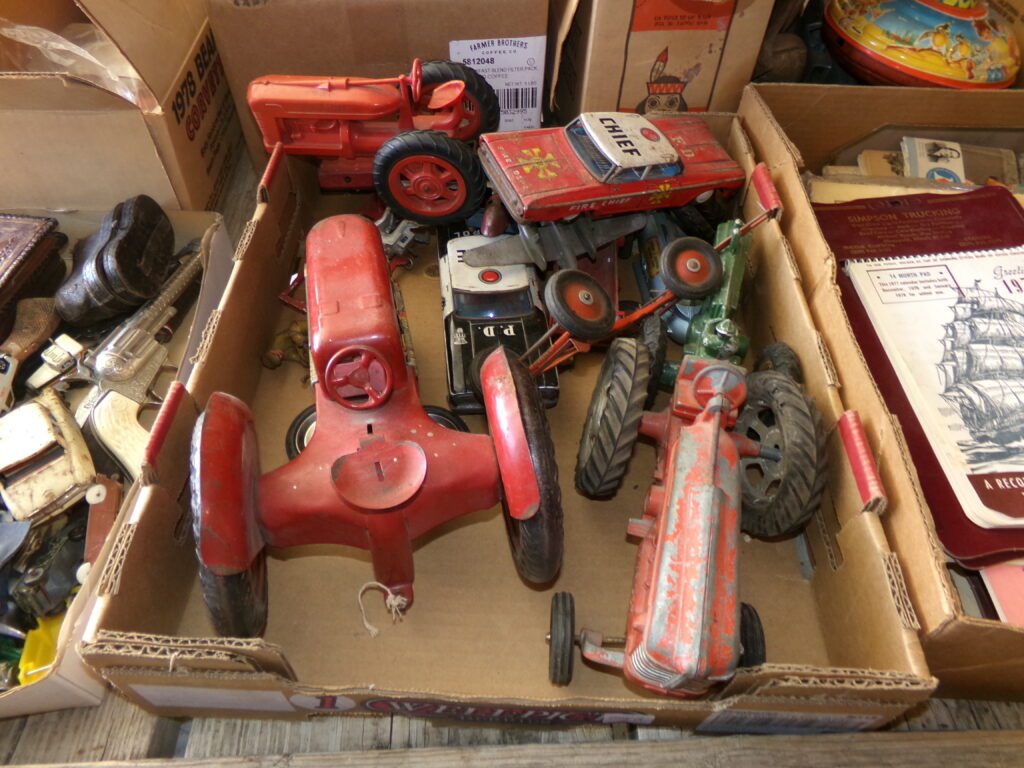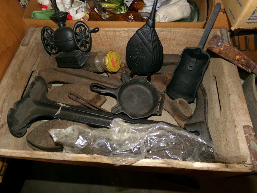 Antiques and Collectibles     Coin collection with many silver coins,Jewelry( few gold and sterling pcs). , Belair Dealer Advertising Book, Vintage hand warmers, Swanson Tonette Bakelite Flute toy, Purina belt buckles, Old buttons, Chicago Bears 1985 Championship button, Skeleton keys, old medals, Old phones, old marbles, old barn lantern, kerosene lamps, Rug beaters, Old papers, Roy Rogers Binder and paper, Wood ironing board, Quilts, Seed bags, Vintage Christmas Ornaments, Seasonal Décor, Montgomery Wards sewing machine, Crock bowls, Fire King Bowl, Banded mixing bowls, Spongeware bowl, Black Lab Cast iron nut cracker, Penhearthy Cast iron paper weight, Cast Iron skillets including one Griswald, Toy Tractors, Tin cars, Wood crates, 2 Wash boards, Chicken Watering Jug, Insulators, Hen on a nest Glass, Avon Christmas, glassware and bottles, Old die cast cars, Marx Train, Spice tins and jars, Green depression glass, several jadeite glass pcs, old Men’s magazines, Kent Feeds thermometer, toy wood blocks, lunch box, Metal roller skate case, Enamel ware, Ash trays, some Hooppole advertising, Old rocket bank, Metal road signs, license plates, Old scale, antique irons, plates, Lincoln and Kennedy picture, oil cans, straight razor, wooden baby hi chair, Cape Cod cranberry wood crate, old pictures, old plat maps, Coco Cola items, coal buckets, stain glass window