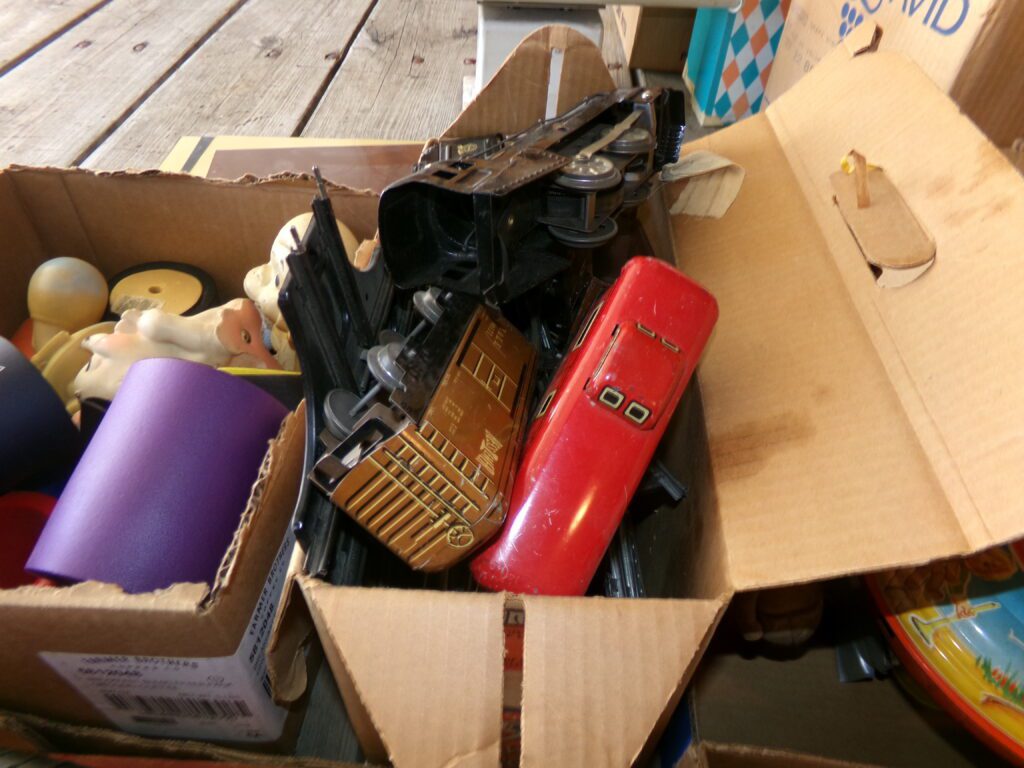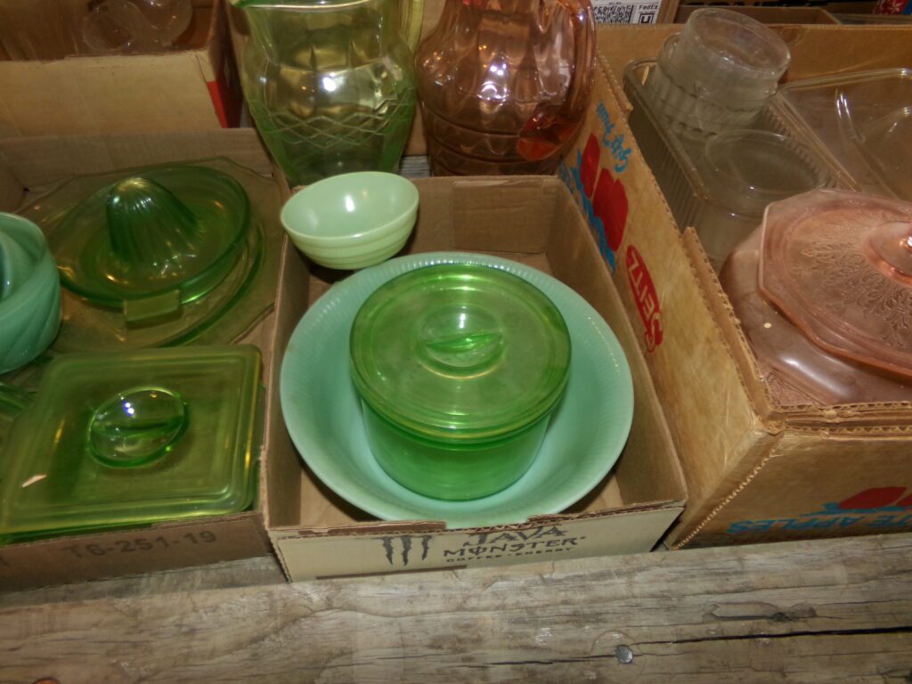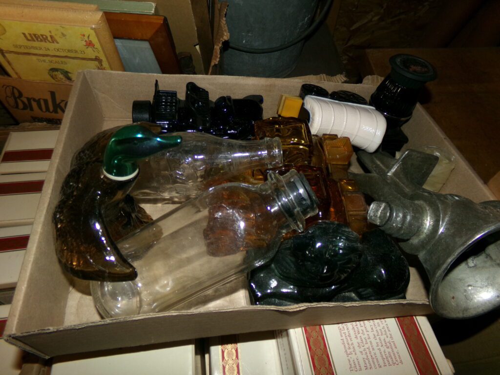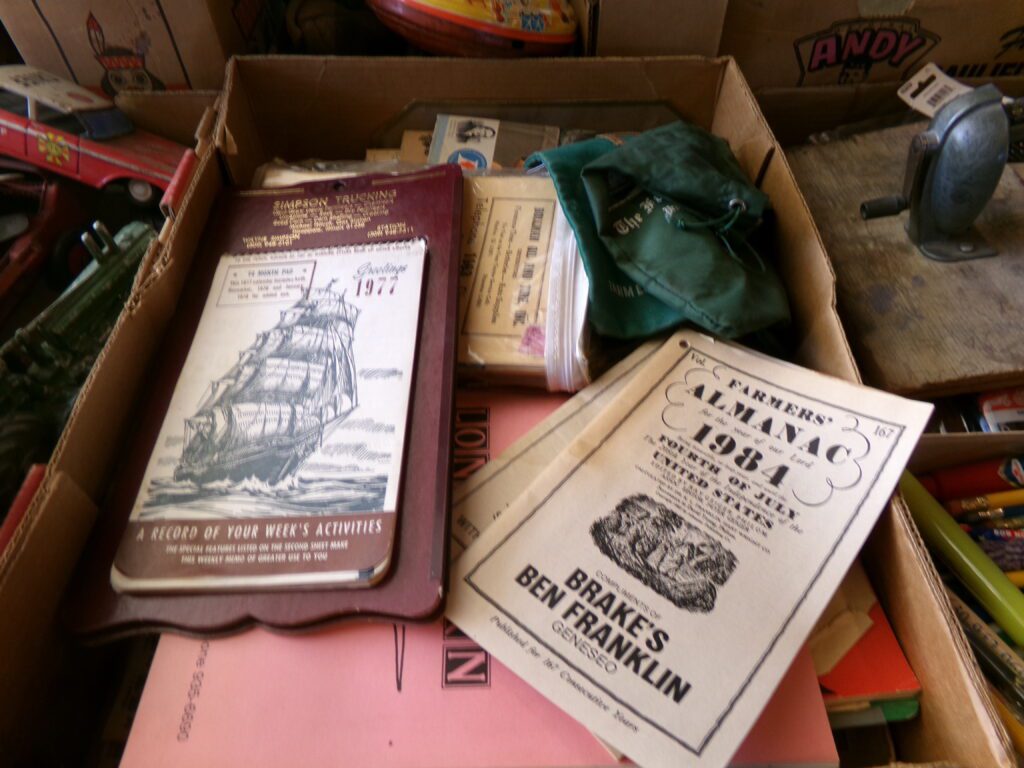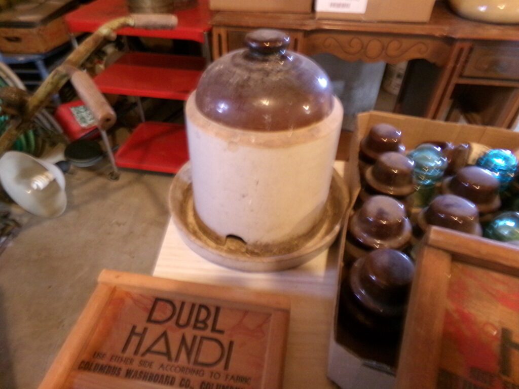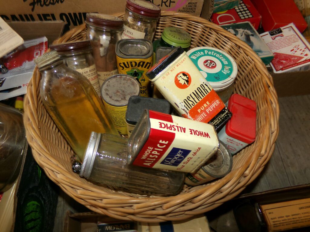 Antiques and Collectibles     Coin collection with many silver coins,Jewelry( few gold and sterling pcs). , Belair Dealer Advertising Book, Vintage hand warmers, Swanson Tonette Bakelite Flute toy, Purina belt buckles, Old buttons, Chicago Bears 1985 Championship button, Skeleton keys, old medals, Old phones, old marbles, old barn lantern, kerosene lamps, Rug beaters, Old papers, Roy Rogers Binder and paper, Wood ironing board, Quilts, Seed bags, Vintage Christmas Ornaments, Seasonal Décor, Montgomery Wards sewing machine, Crock bowls, Fire King Bowl, Banded mixing bowls, Spongeware bowl, Black Lab Cast iron nut cracker, Penhearthy Cast iron paper weight, Cast Iron skillets including one Griswald, Toy Tractors, Tin cars, Wood crates, 2 Wash boards, Chicken Watering Jug, Insulators, Hen on a nest Glass, Avon Christmas, glassware and bottles, Old die cast cars, Marx Train, Spice tins and jars, Green depression glass, several jadeite glass pcs, old Men’s magazines, Kent Feeds thermometer, toy wood blocks, lunch box, Metal roller skate case, Enamel ware, Ash trays, some Hooppole advertising, Old rocket bank, Metal road signs, license plates, Old scale, antique irons, plates, Lincoln and Kennedy picture, oil cans, straight razor, wooden baby hi chair, Cape Cod cranberry wood crate, old pictures, old plat maps, Coco Cola items, coal buckets, stain glass window